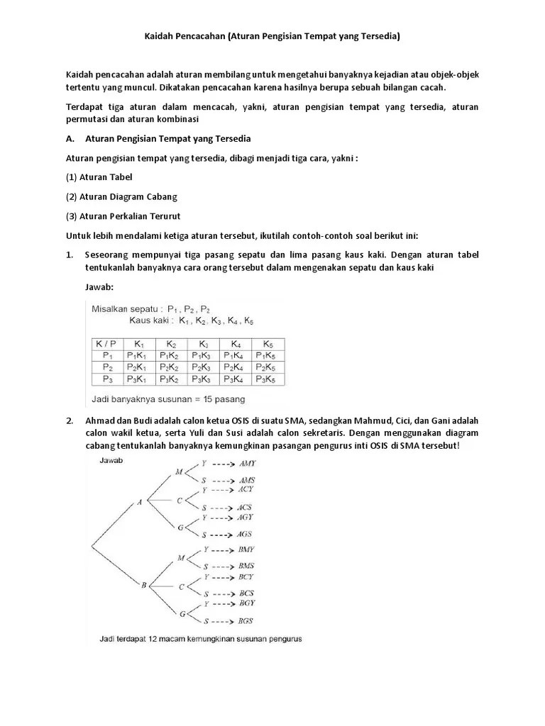 Sebuah dadu dilemparkan satu kali, jika a = {kejadian . 1 contoh soal 1 : Aturan pengisian tempat, permutasi dan kombinasi. Untuk lebih memahami aturan perkalian, perhatikan dua contoh ilustrasi berikut ini. Pengisian tempat yang tersedia (filling slots) atau aturan perkalian. Misalkan terdapat 3 buah celana dan 4 buah baju. Aturan pengisian tempat yang tersedia aturan pengisian kawasan. Sebagai contoh ada suatu kasus di bawah ini: Aturan pengisian tempat yang tersedia (aturan perkalian)||materi, soal & pembahasan||kaidah pencacahan adalah aturan membilang untuk . Berdasarkan contoh soal 8, dapat disimpulkan tentang aturan penjumlahan sebagai. Matematika 1 kaidah pencacahan dan teory peluang aturan pengisian tempat (filling. Suatu bilangan terdiri atas 3 angka yang berbeda. Aturan pengisian tempat persoalan aturan perkalian umumnya berkaitan .